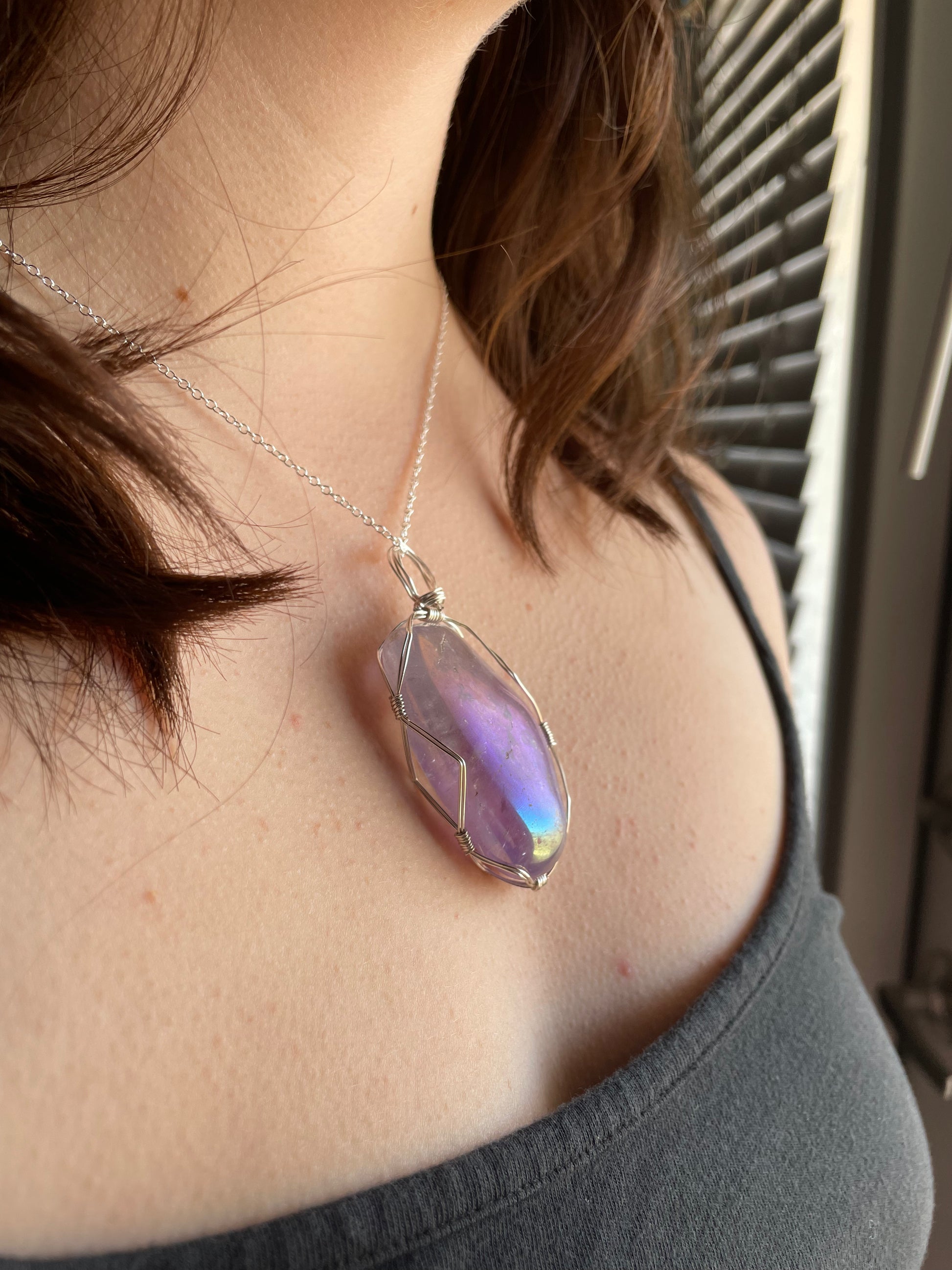 Illuminate your aura with the ethereal beauty of our Angel Aura Amethyst Pendant – a stunning fusion of the calming energy of Amethyst and the iridescent magic of Angel Aura Quartz, chain included!✨