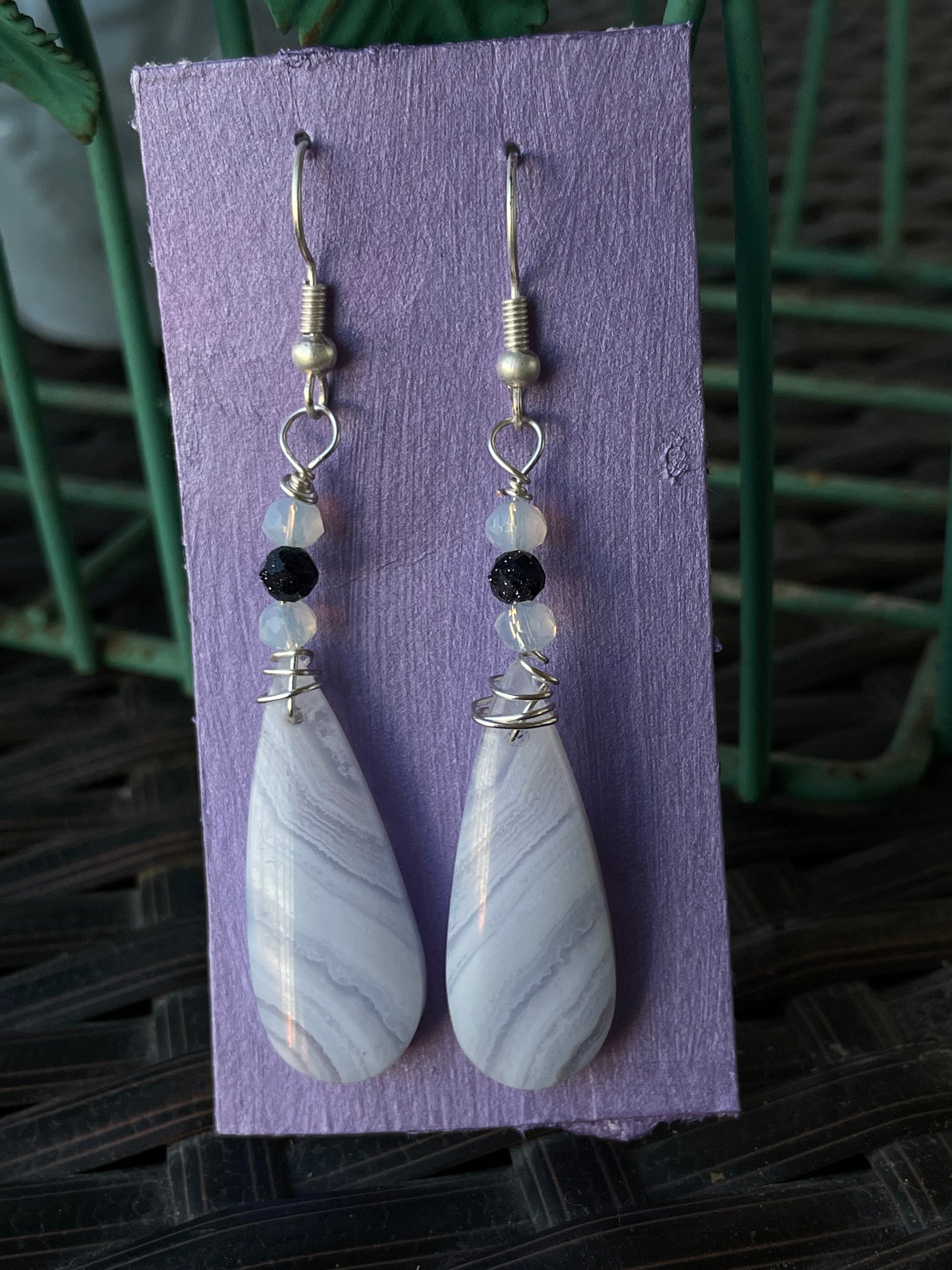 Discover the beauty of these Blue Lace Agate Earrings, a harmonious blend of elegance and sophistication. These exquisite earrings feature enchanting Blue Lace Agate stones, renowned for their calming energy and captivating patterns. Suspended on delicate silver wire, the stones are complemented by the rich allure of black goldstone beads, adding a touch of mystery and glamour. Accentuating the design further are iridescent glass beads, which playfully catch the light, creating a mesmerizing dance of colors. Whether you're dressing up for a special occasion or adding a touch of refined charm to your everyday look, these earrings are a statement of timeless beauty and individuality. Elevate your style with the enchanting fusion of Blue Lace Agate, black goldstone, and iridescent glass beads. 💙🌟