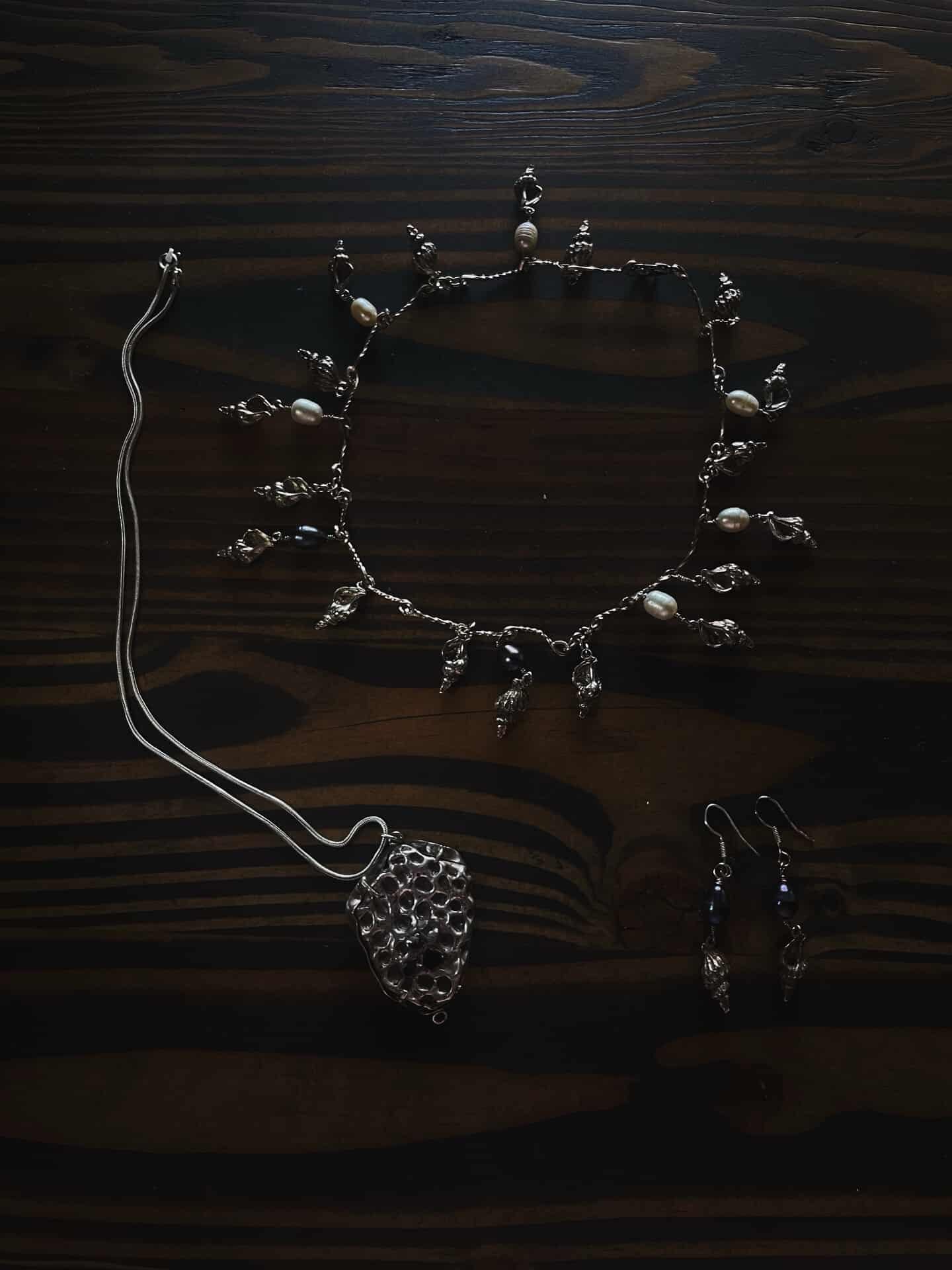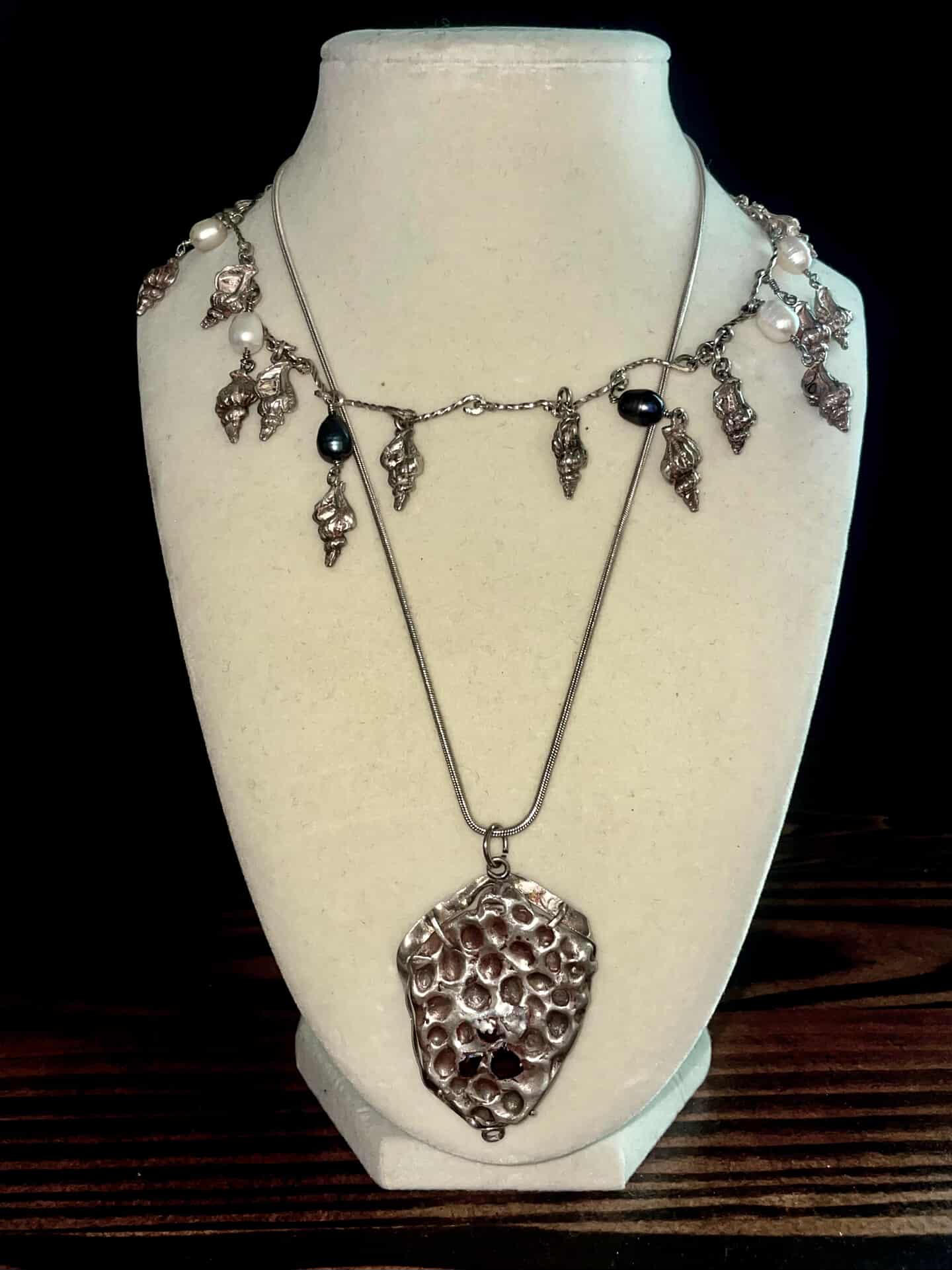 This is a necklace I made in college that I deconstructed! It was modeled after a pomegranate and includes 4 cast in place garnets. The shells were used making a mold of a shell earring I have had since I was 8 and the pearls are from a bracelet off my moms that broke. The piece in its entirety is not for sale, but it is very loved by me and important and this is why it must be displayed! I am open to creating a custom piece similar to this- feel free to email me with inquiries.
