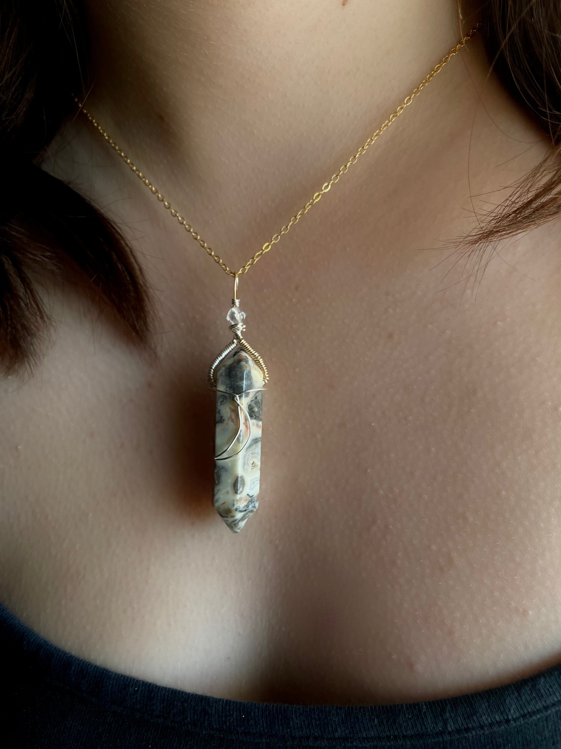 Elevate your style with our Moon and Stars Crazy Lace Agate charm, intricately wrapped in both gold and silver 20-gauge wire. This celestial pendant extends 2.5 inches, adding a touch of cosmic beauty to your collection. Gold and Silver chains included! 🌙✨