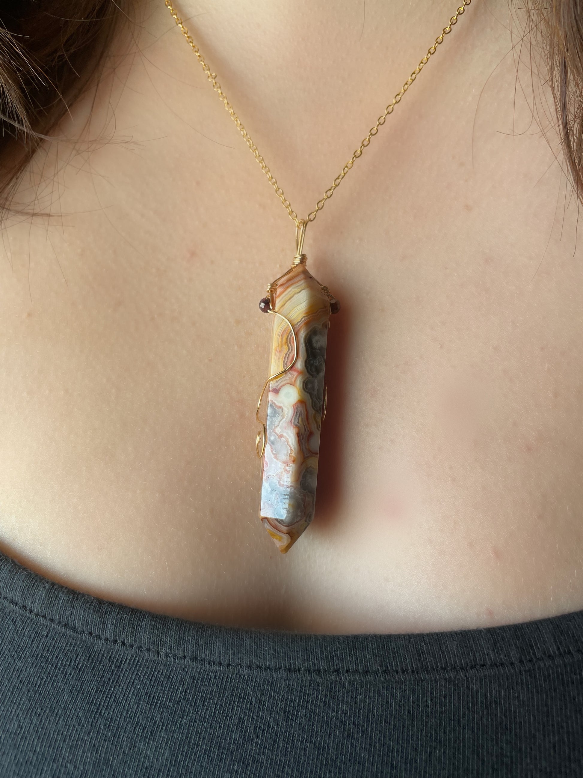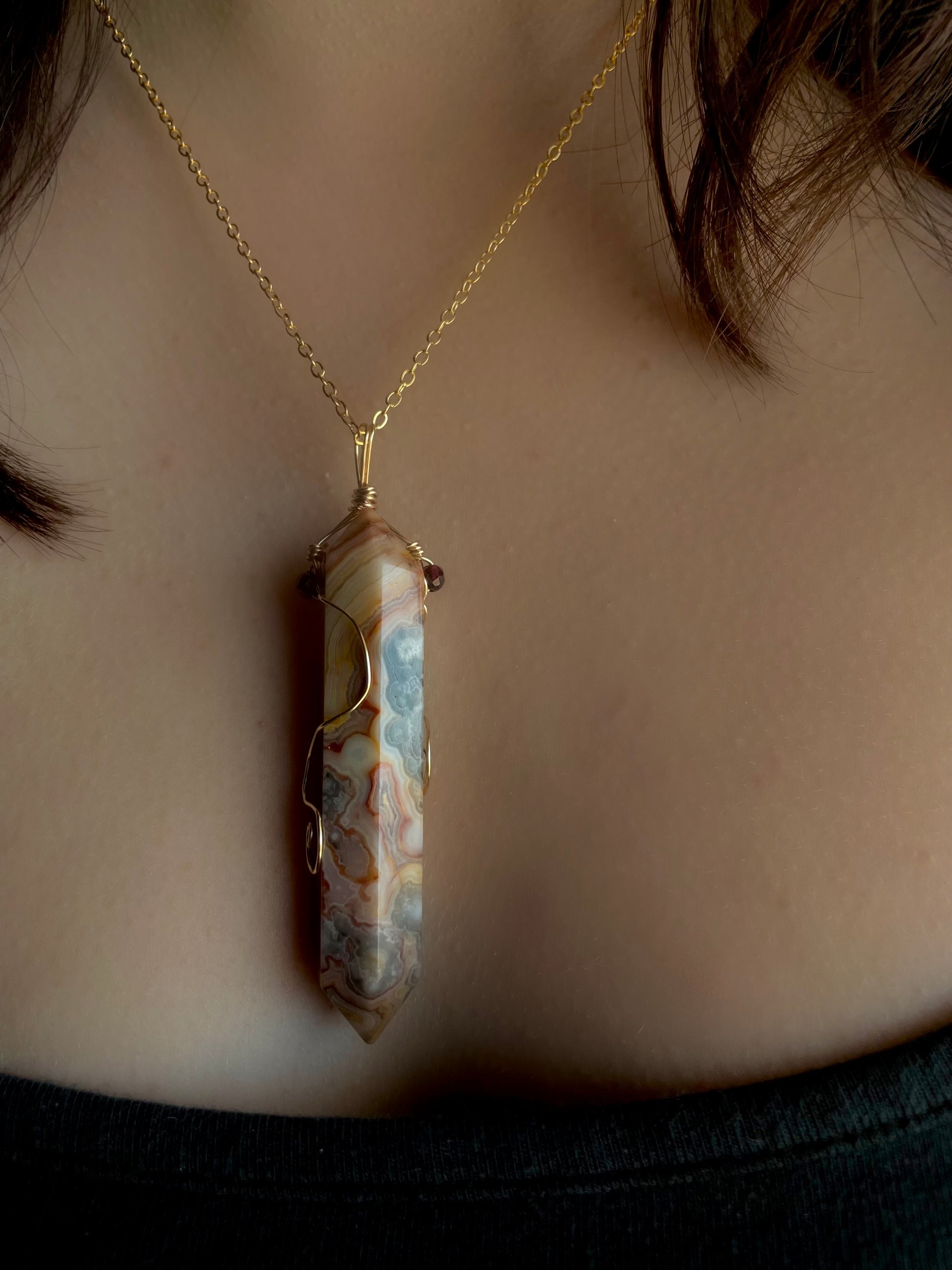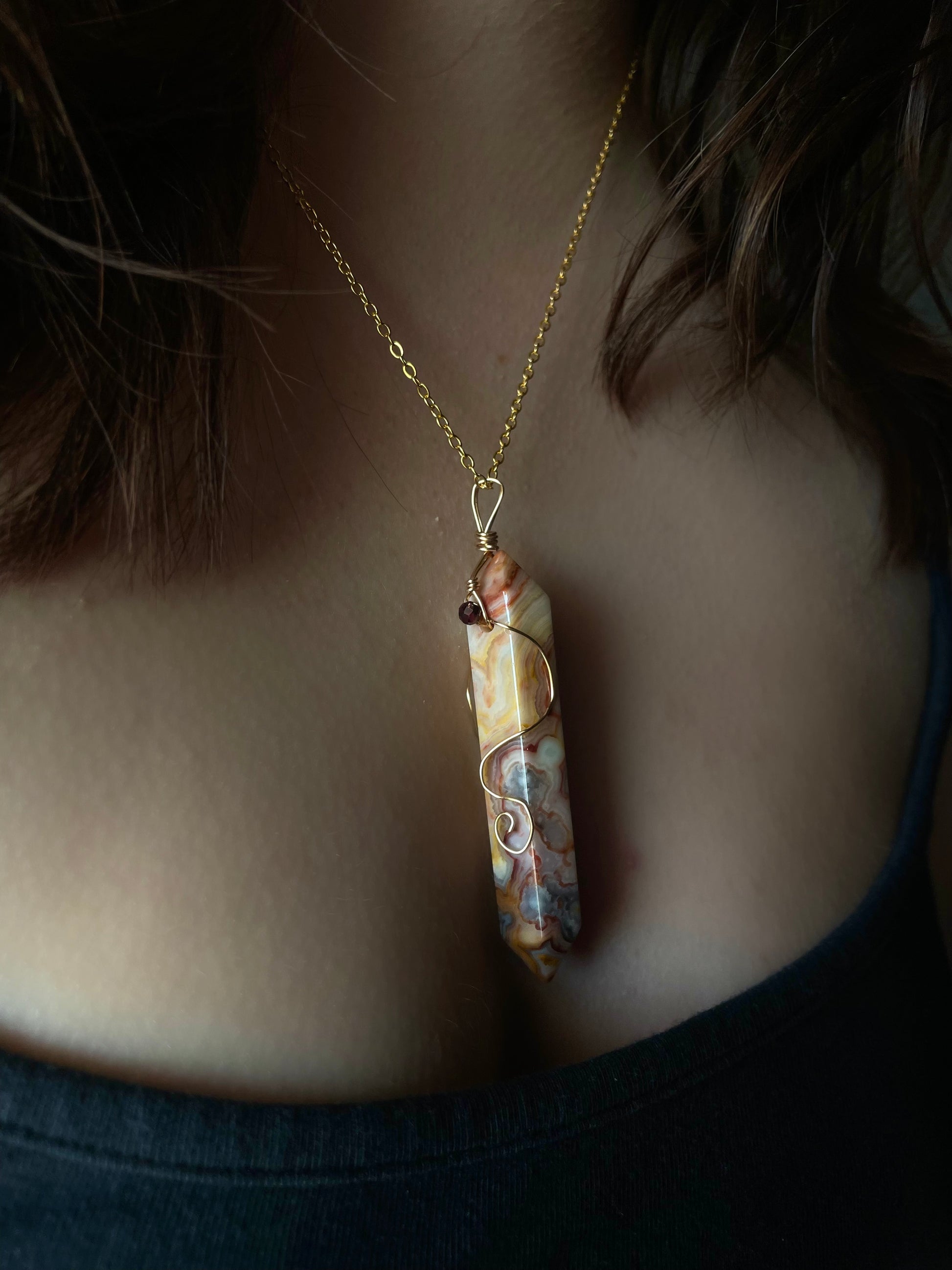 Behold the captivating elegance of our Swirling Brass Crazy Lace Agate and Garnet Pendant, artfully wrapped in brass 20-gauge wire. This enchanting pendant, adorned with garnet beads, extends 3 inches, infusing a sense of richness and mystique. Chain included!🌀✨